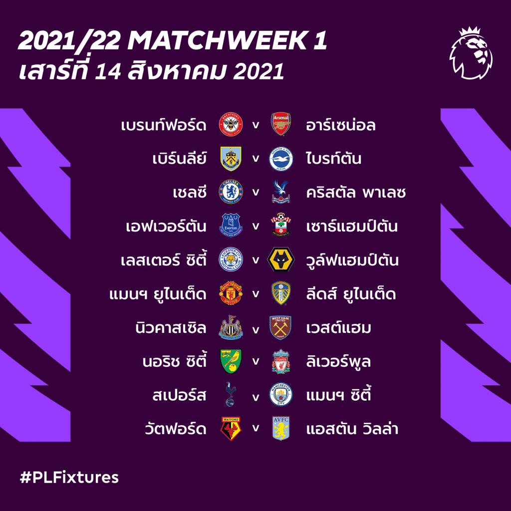 ทั้งนี้ โปรแกรมพรีเมียร์ลีก อังกฤษ 2021/22 ทั้งจำนวน 380 แมตซ์ สามารถดูเพิ่มได้ที่เว็บไซต์ premierleague