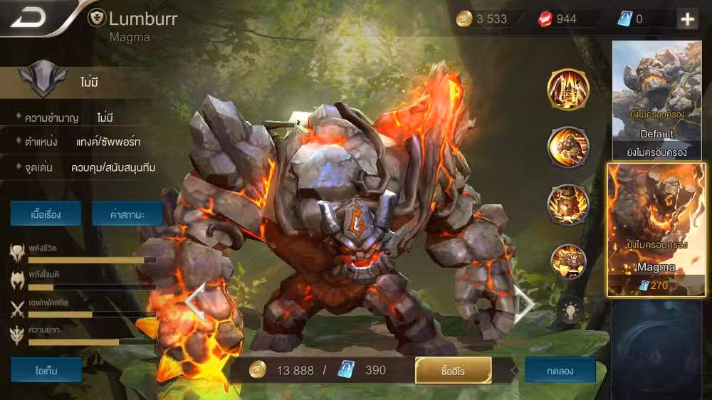 สำหรับตัวละครในเกม Rov ที่ชื่อว่า Lumburr เป็นตัวละครที่มีสกิลการเล่น ที่เหนือกว่าทุกตัวละครไม่ว่าจะเป็นการทุบพื้นดินด้านหน้าจะสามารถสร้างความเสียหายให้กับศัตรูคู่ต่อสู้ฝ่ายตรงข้ามได้อีกครั้งเมื่อพุ่งไปยังทิศทางที่กำหนดจะสร้างความเสียหายและทำให้ศัตรูนั้นลอยขึ้นบนฟ้าเกิดความเสียหาย กับศัตรูได้อย่างยอดเยี่ยมทั้งนี้หลังจากที่ใช้สกิล Lumburr ทุบพื้นอย่างรุนแรงจะทำให้พื้นดินเบื้องหน้านั้นกระแทกฮีโร่ศัตรูคู่ต่อสู้ให้น้อยขึ้นมาและเกิดความเสียหาย