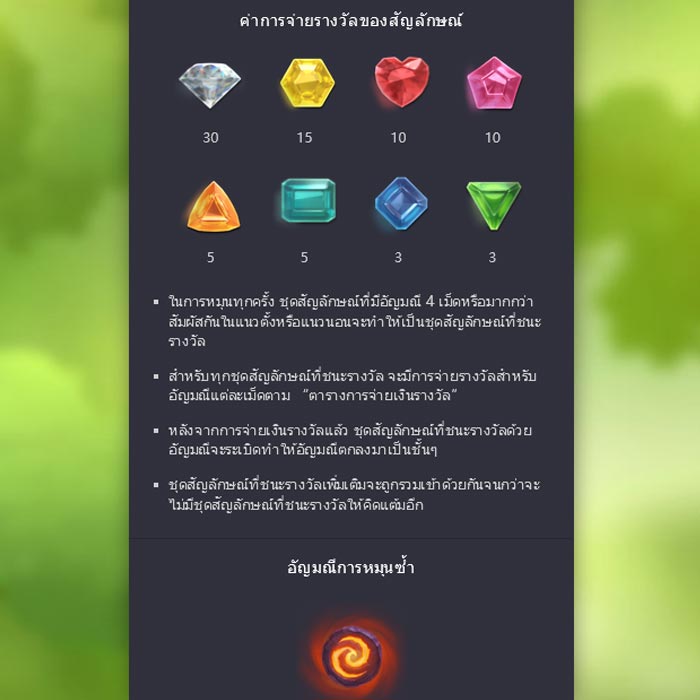 สัญลักษณ์ อัญมณีหัวใจ จะให้อัตราเดิมพันสูงถึง 10 เท่า เป็นสัญลักษณ์ที่ให้อัตราเดิมพันสูงเป็นอันดับที่สาม