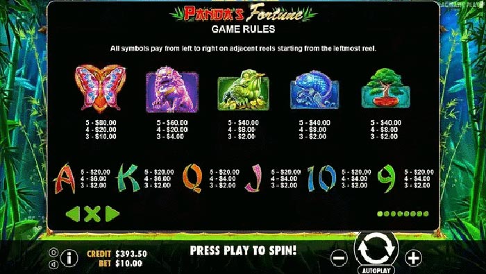 Panda’s Fortune สล็อตวิดีโอขนาด 5 รีล 3 แถวและมีจำนวนเพย์ไลน์ถึง 25 แบบด้วยกัน มาในธีมหมีแพนด้าน่ารักน่าเอ็นดู พร้อมกับรางวัลใหญ่ แจ็คพ็อตที่จ่ายสูงสุดถึง 5,000 เท่า เกมจะมีตัวของสัญลักษณ์ Wild แทนทุกสัญลักษณ์ยกเว้น ฟรีเกม จึงทำให้ตัวสัญลักษณ์ ฟรีเกมนั้นทำการ ปรากฏ 3 ภาพเรียงกันเมื่อไหร่ ถือว่ารับเกมฟรีไปเลย